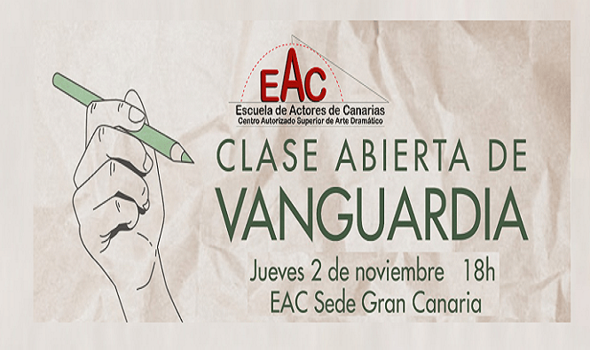 El jueves 2 de noviembre a las 18:00 h., en la Escuela de Actores de Canarias, Centro Autorizado Superior de Arte Dramático (C/ Managua nº 18, Urb. Díaz Casanova- Las Torres) tendrá lugar una “clase abierta” realizada por los/las estudiantes de tercer curso. Dicha clase se sitúa dentro de la asignatura de Interpretación III, módulo de Teatro de Vanguardias y del Absurdo impartido por el profesor D. Enzo Scala.