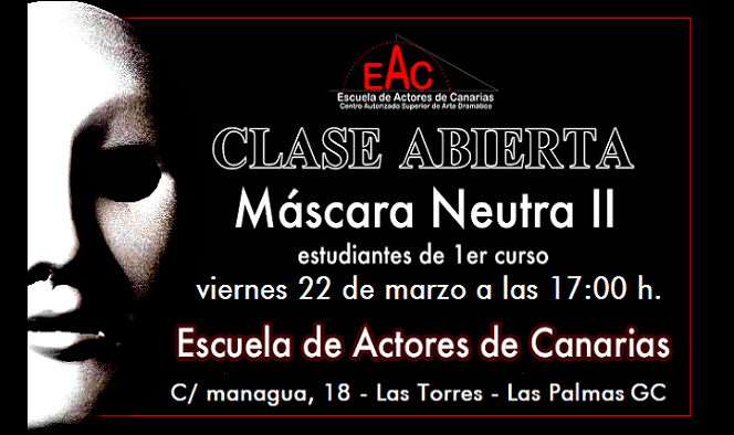El viernes 22 de marzo a las 17:00 h., en la Escuela de Actores de Canarias, Centro Autorizado Superior de Arte Dramático (C/ Managua nº 18, Urb. Díaz Casanova – Las Torres – Las Palmas de GC) tendrá lugar una “clase abierta” realizada por los/las estudiantes de primer curso. Dicha clase se sitúa dentro de la asignatura de Interpretación I, módulo de Máscara Neutra II, impartido por el profesor D. Carlos Belda García.