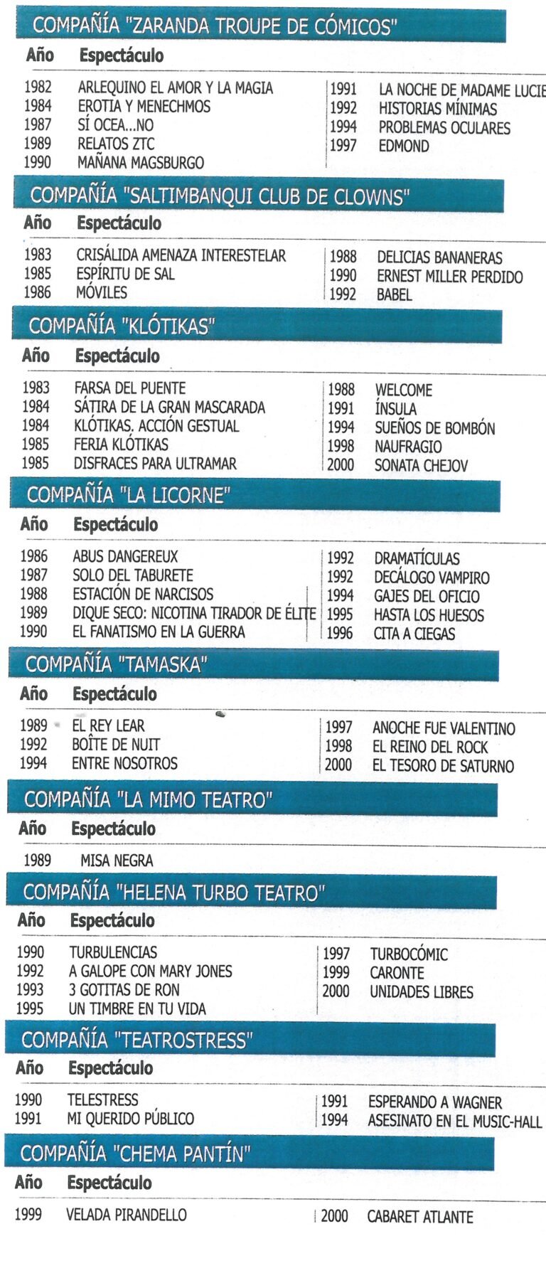 | AÑO | COMPAÑÍA | PRIMER ESPECTÁCULO |