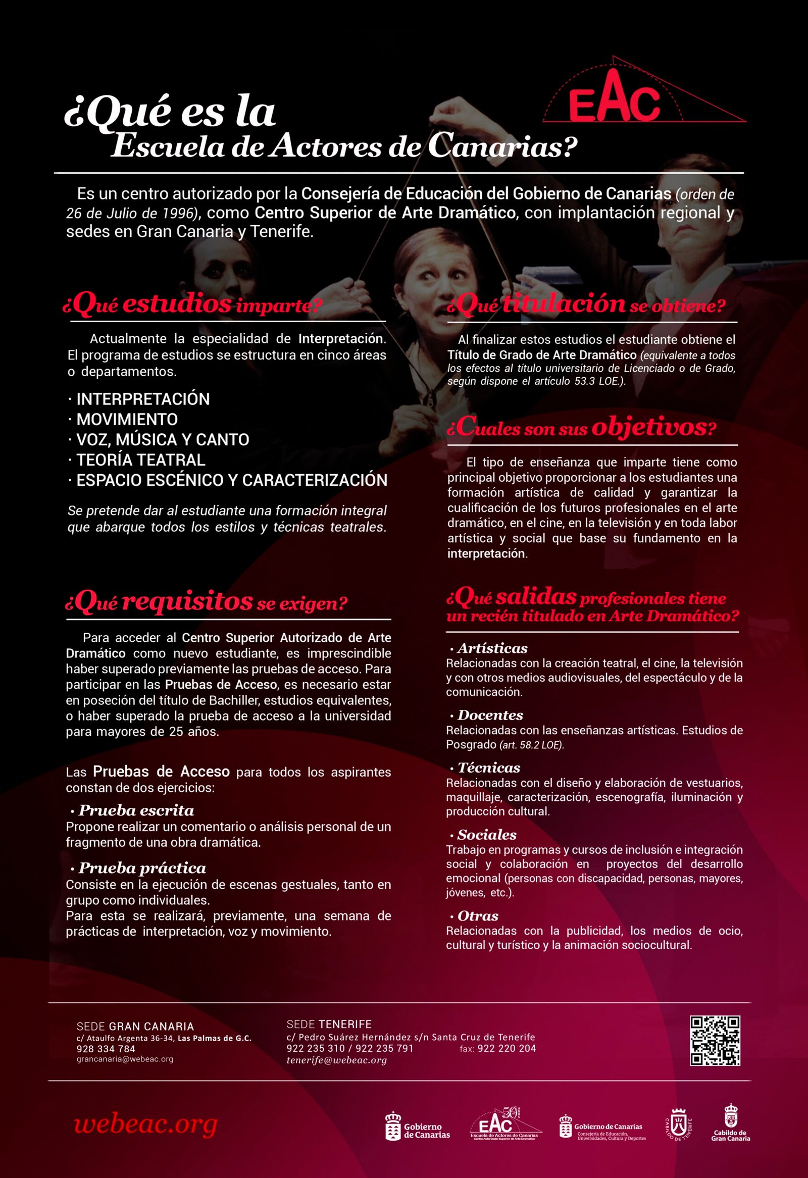 Para acceder al Centro Autorizado Superior de Arte Dramático como nuevo alumno es imprescindible haber superado previamente la prueba de acceso. La Prueba de Acceso Específica a las enseñanzas artísticas superiores de arte dramático, para el curso 2026- 2027, se realizará en la sede de Tenerife de la EAC: