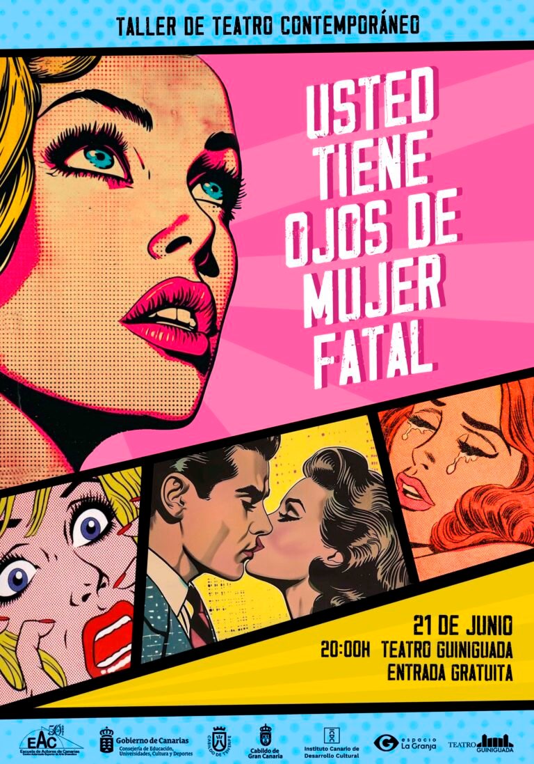 El Taller de Teatro Contemporáneo, plantea una aproximación, lo más cercana posible, a la práctica profesional dentro de los estudios reglados de Arte Dramático en nuestro archipiélago. Como cierre del tercer año de formación, se lleva a cabo la creación de un montaje teatral, con el fin de familiarizarse con todos los elementos que convergen, en la producción de una pieza completa. En esta ocasión, el alumnado del Centro Superior Autorizado Escuela de Actores de Canarias, en su sede de Tenerife y formado por veintiún intérpretes, darán vida a «Usted tiene ojos de mujer fatal».