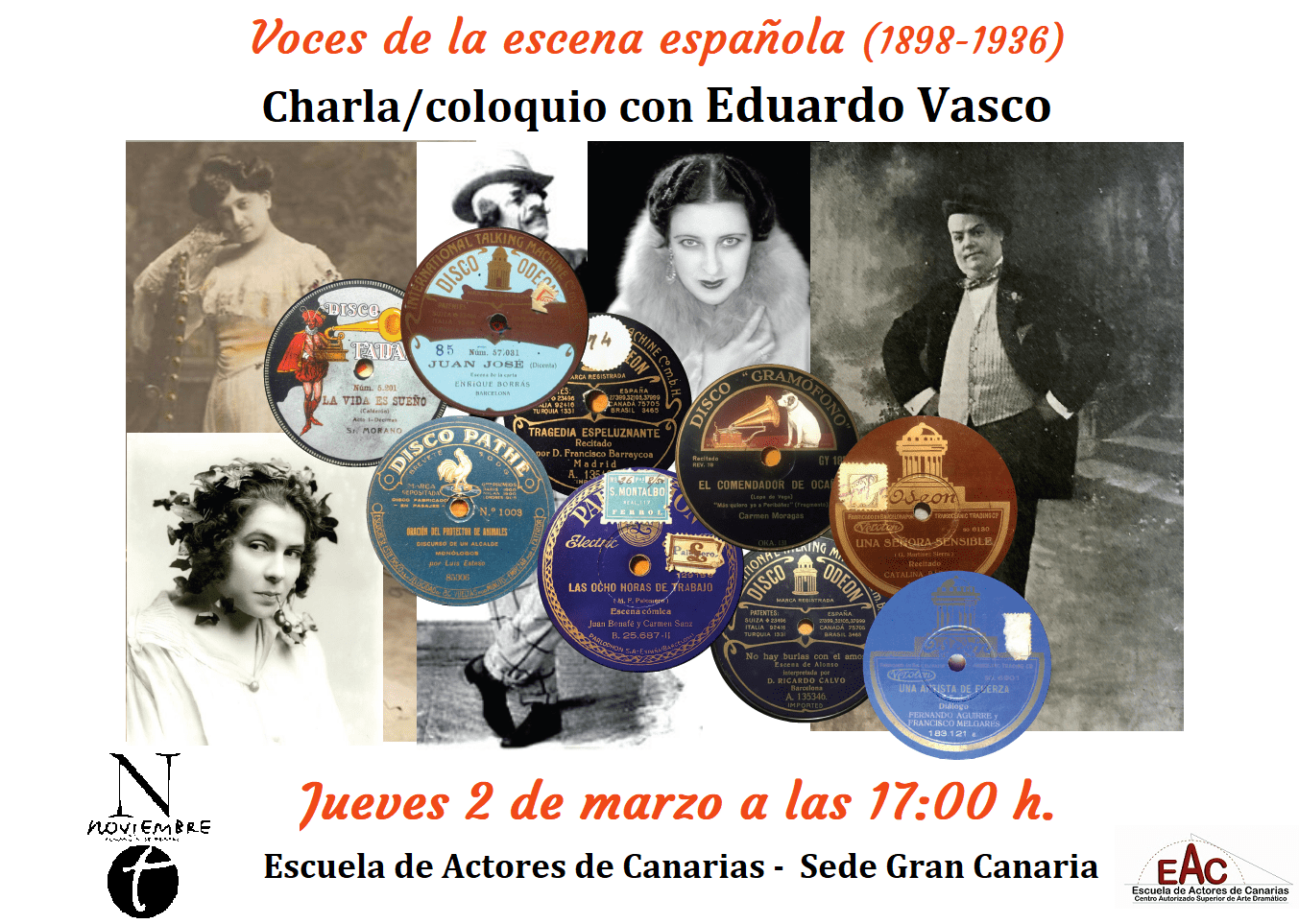 El próximo jueves 2 de marzo a las 17:00 h., tendrá lugar en la Escuela de Actores de Canarias, Centro Autorizado Superior de Arte Dramático, Sede Gran Canaria, la charla Voces de la escena española (1898-1936),  impartida por Eduardo Vasco.